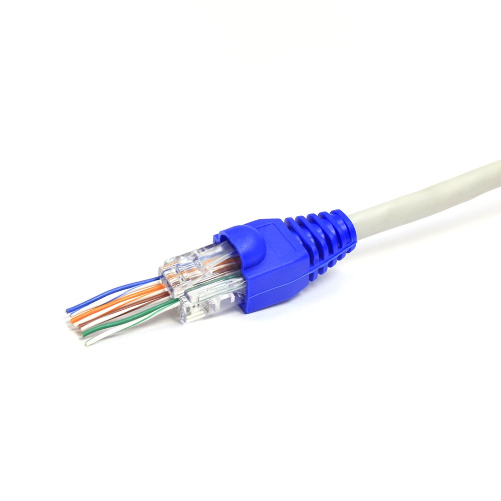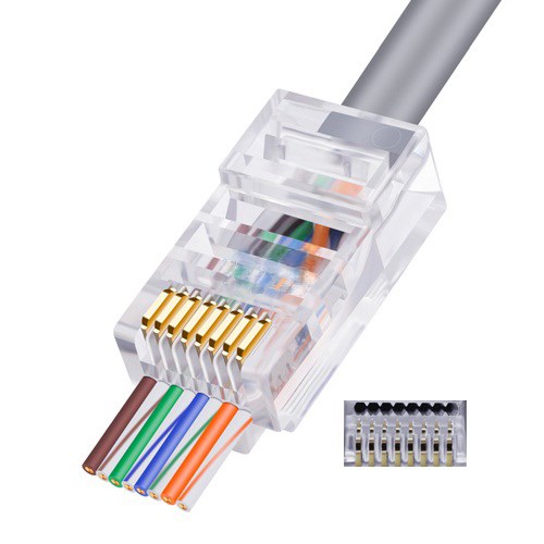 Разъем сквозной RJ-45 (8p8c) Тип разъема: 8P8C (RJ-45). Тип витой пары: одножильная или многожильная UTP Кат. 5e Для проводников толщиной до 24 AWG (0.51 мм) Контакты разъема имеют три ножа, что позволяет их использовать, как для одножильного, так и многожильного кабеля.